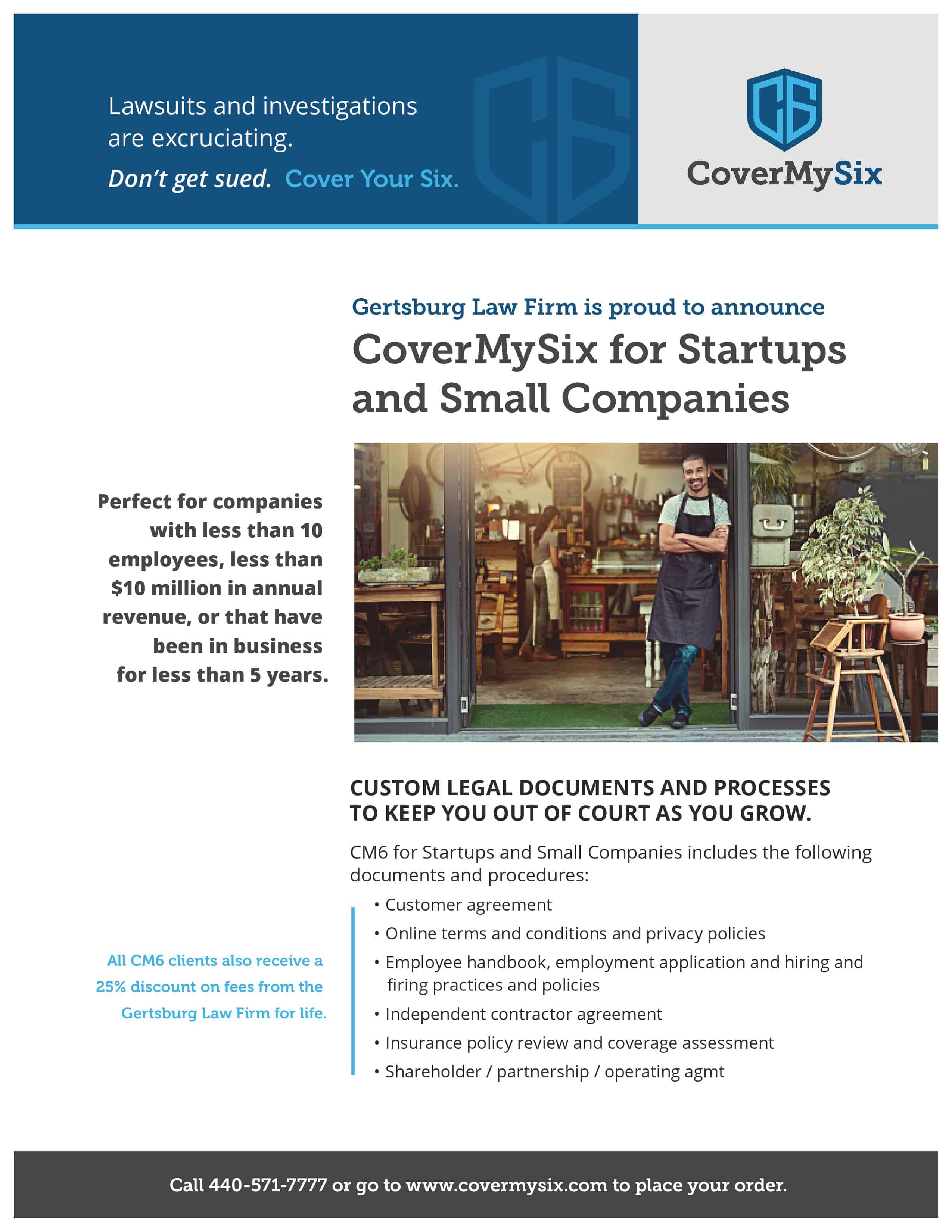 3. CoverMySix for Small Companies and Start-Ups – We are proud to roll out CoverMySix for SmallCo’s and Startups. Newer and smaller companies can now take advantage of more affordable pricing for a complete legal documentation portfolio designed to minimize exposure to lawsuits. Whether you have a large company or a small start-up, check out www.covermysix.com to learn about the full CM6 audit suite.