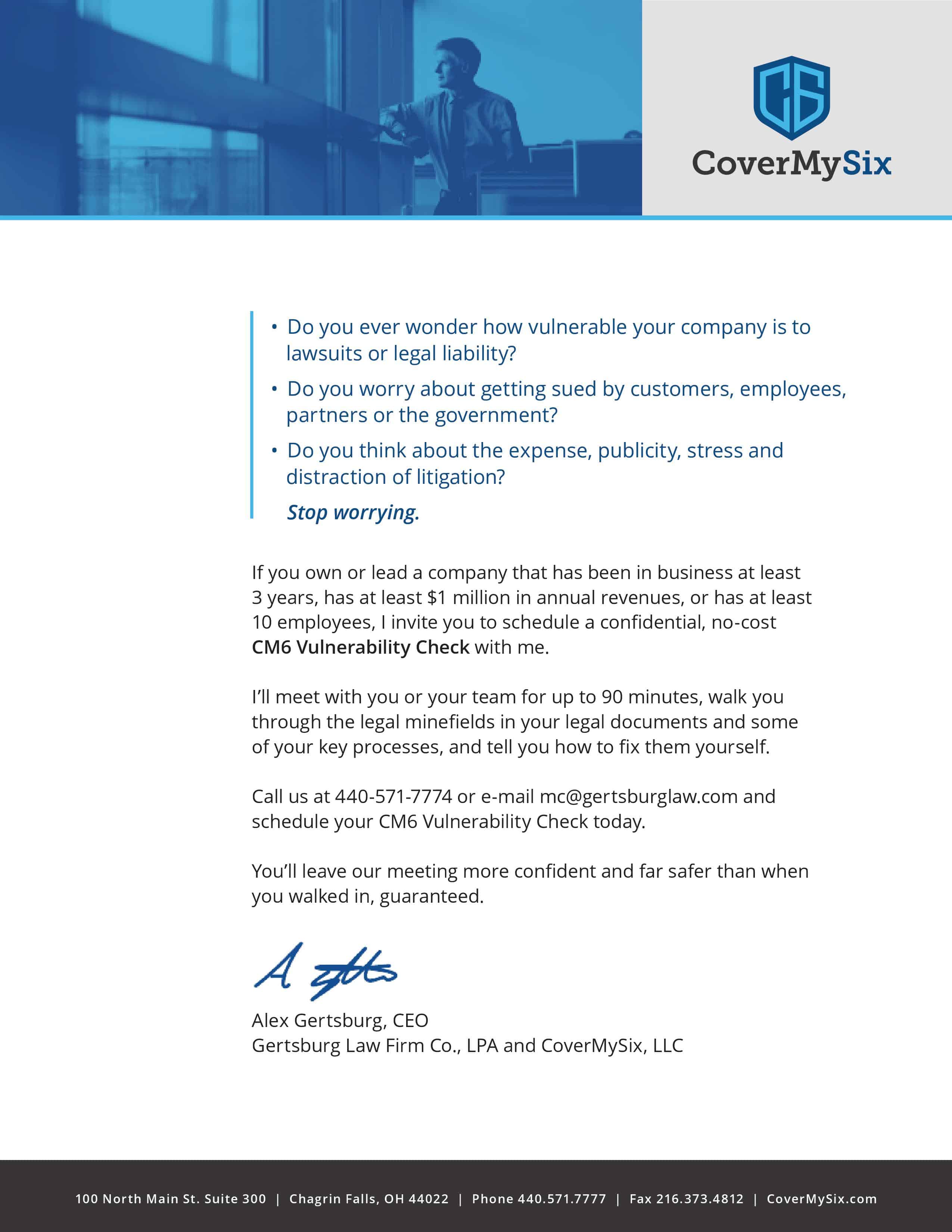An audit of your policies can help you avoid the pain of lawsuits. The Gertsburg Law Firm now offers CoverMySix, a one-stop legal audit for your business, led by award-winning litigators and in-house counsel. CM6 minimizes your exposure to lawsuits, investigations, disgruntled employees and customers, and all the damage that comes with them. Schedule a confidential, no-cost CM6 Vulnerability Check with Gertsburg Law Firm’s CEO, who will walk you through the minefields in your documents and key processes and tell you how to fix them yourself. Call 440-571-7774 or e-mail [email protected] to schedule your CM6 Vulnerability Check today. Newer or smaller companies will want to take advantage of CoverMySix for Small Companies and Startups complete legal documentation portfolio. Check out covermysix.com to learn about the full CM6 audit suite.