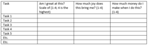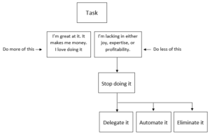 - If it brings me money and joy but I suck at it, someone else should be doing it so I can do things I’m great at (which is then more likely to make me and those around me happier).